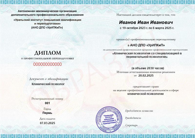- Образец диплома о профессиональной переподготовке.